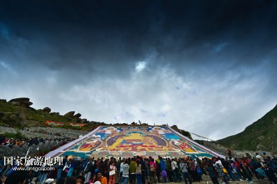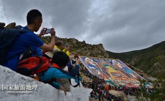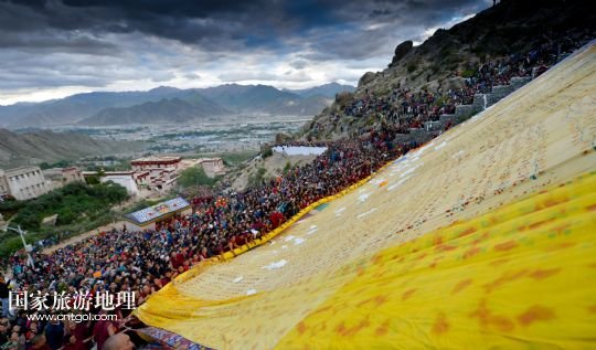 國(guó)家旅游地理 西藏拉薩8月6日訊 8月6日,拉薩哲蚌寺舉行展佛儀式。當(dāng)日,以西藏最大的格魯派寺廟哲蚌寺展佛為開(kāi)端的雪頓節(jié)在拉薩拉開(kāi)序幕。每年藏歷六月底七月初是西藏傳統(tǒng)的節(jié)日“雪頓節(jié)”。在藏語(yǔ)中,“雪”是酸奶子的意思,“頓”是“吃”“宴”的意思,“雪頓節(jié)”按藏語(yǔ)解釋就是吃酸奶子的節(jié)日,因此又叫“酸奶節(jié)”。因?yàn)?ldquo;雪頓節(jié)”期間有隆重?zé)崃业牟貞蜓莩龊鸵?guī)模盛大的曬佛儀式,所以有人也稱之為“藏戲節(jié)”“曬佛節(jié)”。 /新華社記者 普布扎西攝