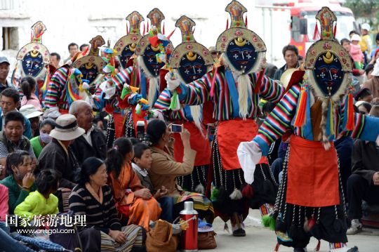 8月6日,在西藏堆龍德慶縣乃瓊鎮(zhèn)甲熱村舉行的雪頓節(jié)曬佛慶典上,甲熱村覺(jué)木隆藏戲團(tuán)的演員們?nèi)雸?chǎng)表演。
