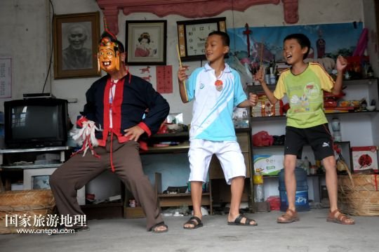 國家旅游地理 廣西河池8月19日訊 8月18日,譚圣慈老人(左一)帶著前來學(xué)習(xí)的兩名男孩跳儺面舞。在廣西北部與貴州交界一帶的我國唯一的毛南族自治縣——環(huán)江毛南族自治縣,神秘的儺戲被譽(yù)為毛南族的“族寶”。原始古樸、風(fēng)格獨(dú)特的儺戲是毛南族的民間傳統(tǒng)舞蹈,藝人在表演過程中經(jīng)常戴著被稱為儺面的木制面具。儺面一般高30厘米、寬20厘米,由毛南族藝人在民族口頭文學(xué)的基礎(chǔ)上依據(jù)個(gè)人想象創(chuàng)作,用優(yōu)質(zhì)木塊雕琢而成,共有文、武、善、兇四大類72種面相。