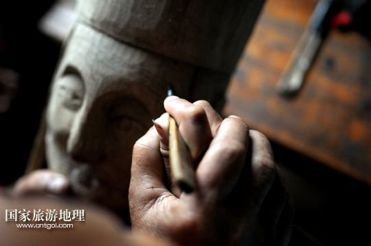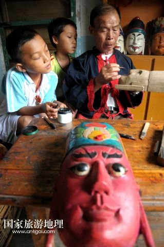 譚圣慈老人今年72歲,從22歲開始學(xué)雕刻儺戲面具,迄今,已經(jīng)堅(jiān)持了50年。老人說,他制作的面具因工藝精湛,造型優(yōu)美,曾吸引遠(yuǎn)方的客人高價(jià)購買。但是,卻少有人來學(xué)習(xí)面具的雕刻與制作。儺戲于2006年被列入非物質(zhì)文化遺產(chǎn)名錄之后,政府加大了保護(hù)力度,但因?yàn)槊婢叩闹谱髦芷陂L、工序復(fù)雜,銷售渠道少等原因,仍無法吸引年輕人學(xué)習(xí)雕刻的興趣。為了收到心儀的徒弟,傳承這獨(dú)到的技藝,他到處發(fā)布免費(fèi)收學(xué)徒的信息。在他的堅(jiān)持下,今年暑期,鄉(xiāng)里有兩名對(duì)面具制作感興趣的男孩來到譚圣慈身邊學(xué)藝。老人高興地說:“我給他們講很多故事,就是希望他們能對(duì)此提起興趣,愛上木面雕刻,別讓這老手藝失傳了。” /新華社發(fā)