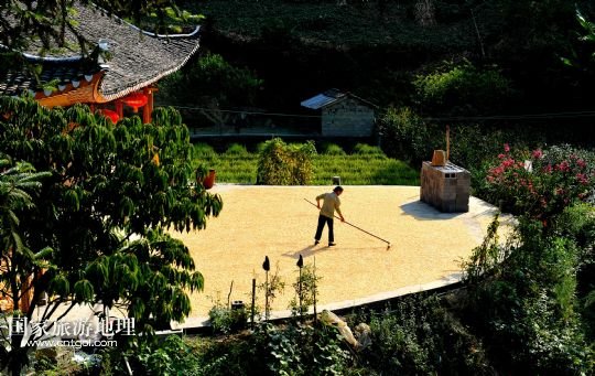 8月22日,湖北省宣恩縣水田壩村農(nóng)民在吊腳樓前翻動(dòng)晾曬的玉米。