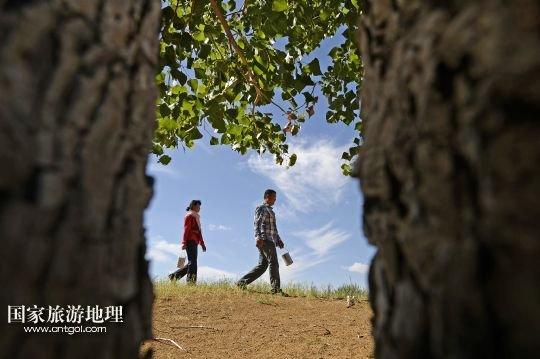 顧蕓香與丈夫在治沙現(xiàn)場(chǎng)查看已經(jīng)成材的大樹(shù)(7月23日攝)。