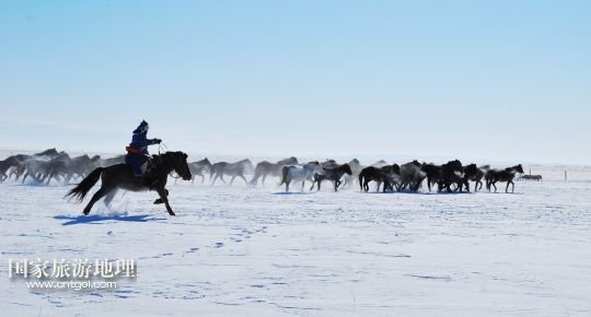 一名牧民在內(nèi)蒙古赤峰市克什克騰的雪原上牧馬(2012年2月3日攝)