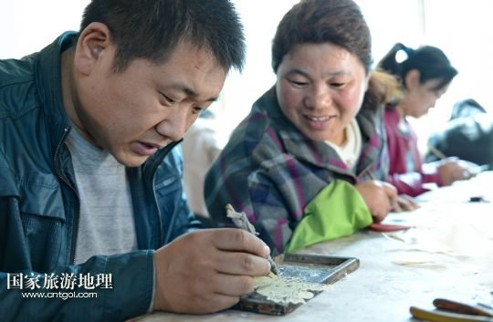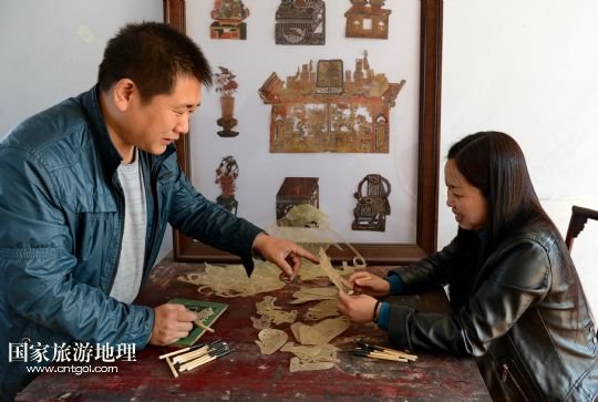 國家旅游地理 河北唐山4月2日訊 郭寶在檢查一件皮影藝術品的雕刻質量(3月30日攝)。河北省遷安市趙店子鎮(zhèn)馬古寺村村民郭寶自幼喜歡皮影雕刻,師承當?shù)氐窨趟嚾送跽淅舷壬窨痰挠叭嗽煨凸艠?、工藝精細,深受皮影收藏愛好者的歡迎。2003年,郭寶成立了“郭寶皮影傳承工作室”,并從村里招來20多位喜歡皮影藝術的農民專門從事皮影雕刻。經過幾年的發(fā)展,如今郭寶皮影工作室開發(fā)設計皮影工藝品3000余種,在傳承保護唐山皮影的同時還獲得了豐厚的收入。 /新華社記者楊世堯攝