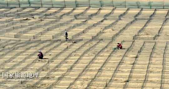 國家旅游地理 內(nèi)蒙古阿拉善4月21日訊 錯(cuò)落布局在內(nèi)蒙古臨策鐵路(臨河——策克)旁的網(wǎng)格沙障(4月18日攝)。穿越我國北疆內(nèi)蒙古阿拉善高原大漠的呼和浩特鐵路局臨策鐵路沿線有400多公里“無人區(qū)”,這里常年干旱少雨、風(fēng)沙肆虐、植被稀少、人跡罕至,30多萬平方公里的荒漠、戈壁縱橫交錯(cuò),自然條件極度惡劣。