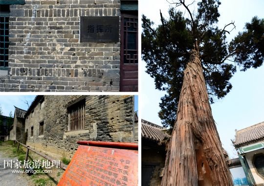 位于臺兒莊古城的臺兒莊大戰(zhàn)指揮所(左上)、民居(左下)和清真寺內(nèi)柏樹(右)上,仍保存著當(dāng)年臺兒莊大戰(zhàn)中留下來的彈孔(拼版照片,4月8日攝)。