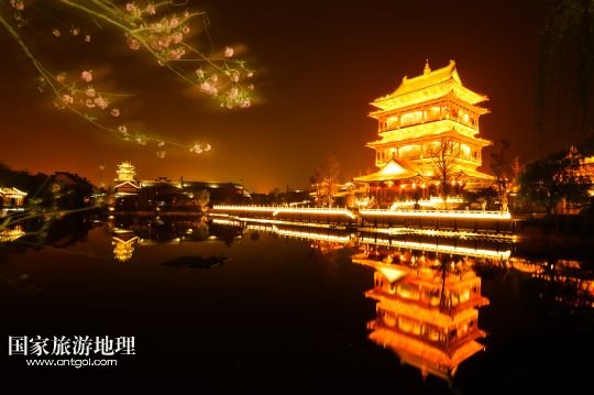 國家旅游地理 山東棗莊4月22日訊 這是夜色下的臺兒莊古城復(fù)興樓(4月8日攝)。1938年春的臺兒莊大戰(zhàn),是抗日戰(zhàn)爭爆發(fā)后中國軍隊在正面戰(zhàn)場取得的一次重大勝利。臺兒莊是世界著名的二戰(zhàn)紀(jì)念城市,有著2000多年歷史的臺兒莊古城完好地保存著53處戰(zhàn)爭遺跡。