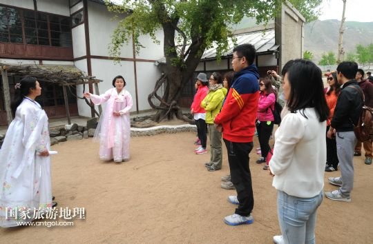 中國游客在參觀朝鮮南陽國際旅館(5月2日攝)。