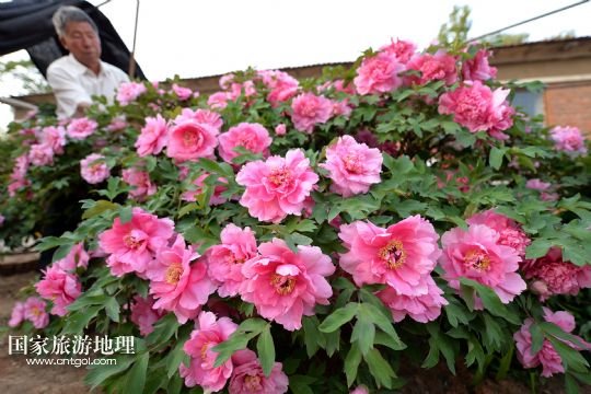 國(guó)家旅游地理 內(nèi)蒙古赤峰5月23日訊 5月22日在內(nèi)蒙古寧城縣長(zhǎng)皋村烏氏家族的庭院里拍攝的盛開(kāi)的牡丹花。在內(nèi)蒙古赤峰市寧城縣小城子鎮(zhèn)長(zhǎng)皋村,有一株300多歲“高齡”的牡丹成為當(dāng)?shù)匾痪?。該株牡丹枝高約1.7米,直徑約3米,康熙年間作為皇家嫁妝移植至此,雖經(jīng)300余年的風(fēng)風(fēng)雨雨,如今仍不失國(guó)色天香,每年吸引大批游人前來(lái)觀賞。新華社發(fā)(白鐵軍 攝)