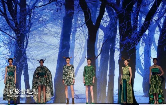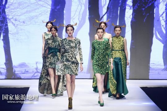 5月9日,模特在“2015杭州國際時尚周”開幕式上展示英國寶萊達服裝設計公司主題為“樹靈派對”的時裝。