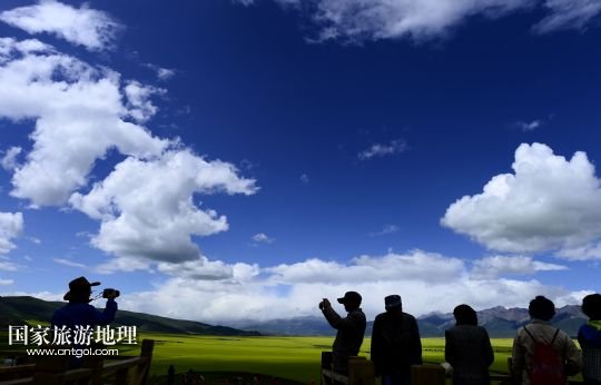 7月22日,游客在門源油菜花田的觀花臺(tái)上觀賞。