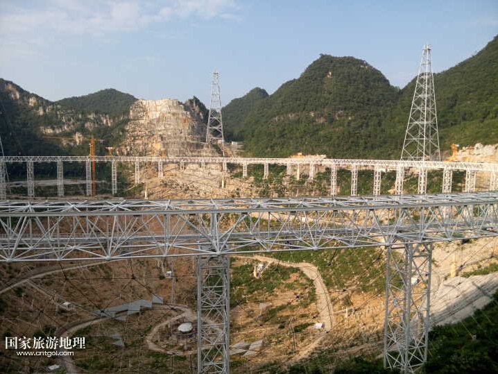 這是黔南平塘縣正在建設(shè)的大射電望遠(yuǎn)鏡,也稱 FAST,預(yù)計(jì)將于明年九月建成。FAST具有中國獨(dú)立自主知識(shí)產(chǎn)權(quán),是世界上正在建造及計(jì)劃中的口徑最大、最具威力的單天線射電望遠(yuǎn)鏡,其設(shè)計(jì)綜合體現(xiàn)了我國高技術(shù)創(chuàng)新能力。500米口徑球面射電望遠(yuǎn)鏡是利用貴州喀斯特地區(qū)的洼坑作為望遠(yuǎn)鏡臺(tái)址,建造世界第一大單口徑射電望遠(yuǎn)鏡,其擁有30個(gè)標(biāo)準(zhǔn)足球場大的接收面積。FAST作為世界最大的單口徑望遠(yuǎn)鏡,將在未來20至30年保持世界一流地位。