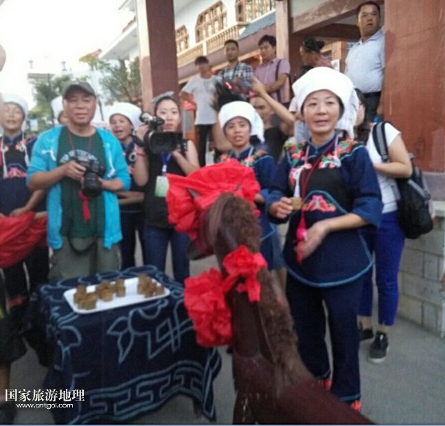 這是黔南惠水縣好花紅布依風(fēng)情寨,為了歡迎遠(yuǎn)方客人的到來,布依族人在寨門前擺滿酒杯唱起山歌。在進(jìn)寨前客人都要喝三杯攔門酒,喝完才能進(jìn)入寨中。同時(shí),布依族習(xí)俗中,遠(yuǎn)方客人到來,坐上木馬,喝完三杯米酒也寓意著會(huì)交好運(yùn)。